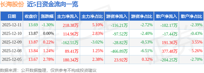 证券之星消息,截至2025年12月11日收盘,长海股份(300196)报收于13.69元,下跌1.3%,换手率1.26%,成交量3.1万手,成交额4279.86万元。