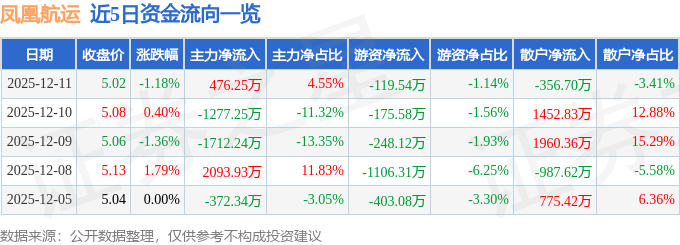 证券之星消息,截至2025年12月11日收盘,凤凰航运(000520)报收于5.02元,下跌1.18%,换手率2.04%,成交量20.68万手,成交额1.05亿元。