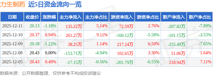 证券之星消息,截至2025年12月11日收盘,力生制药(002393)报收于20.13元,下跌1.18%,换手率0.52%,成交量1.3万手,成交额2632.8万元。