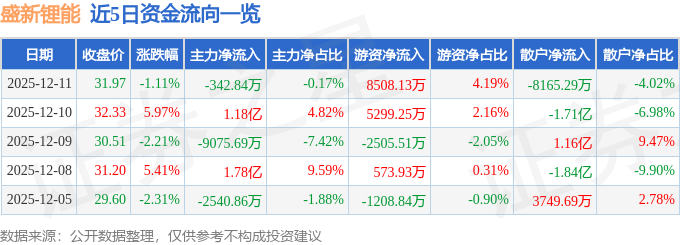 证券之星消息,截至2025年12月11日收盘,盛新锂能(002240)报收于31.97元,下跌1.11%,换手率7.2%,成交量62.35万手,成交额20.3亿元。