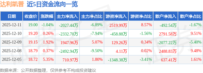 证券之星消息,截至2025年12月11日收盘,达利凯普(301566)报收于19.0元,下跌1.04%,换手率7.38%,成交量15.31万手,成交额2.94亿元。