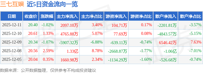 证券之星消息,截至2025年12月11日收盘,三七互娱(002555)报收于20.4元,下跌1.02%,换手率1.88%,成交量30.09万手,成交额6.17亿元。