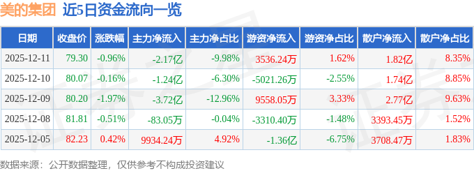 证券之星消息,截至2025年12月11日收盘,美的集团(000333)报收于79.3元,下跌0.96%,换手率0.39%,成交量27.29万手,成交额21.79亿元。