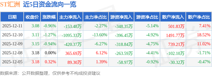 证券之星消息,截至2025年12月11日收盘,ST汇洲(002122)报收于3.08元,下跌0.96%,换手率1.1%,成交量21.93万手,成交额6776.02万元。