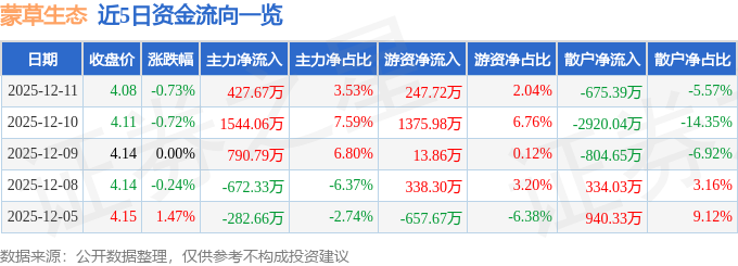 证券之星消息,截至2025年12月11日收盘,蒙草生态(300355)报收于4.08元,下跌0.73%,换手率2.28%,成交量29.64万手,成交额1.21亿元。