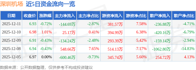 证券之星消息,截至2025年12月11日收盘,深圳机场(000089)报收于6.93元,下跌0.72%,换手率0.35%,成交量7.24万手,成交额5034.1万元。