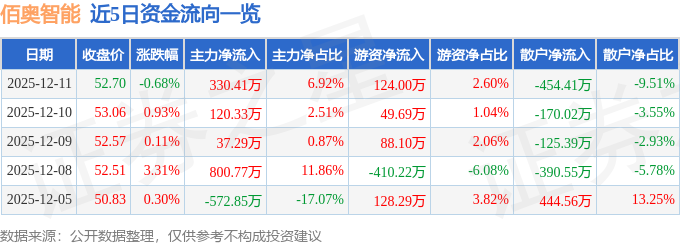 证券之星消息,截至2025年12月11日收盘,佰奥智能(300836)报收于52.7元,下跌0.68%,换手率1.43%,成交量9044.0手,成交额4776.49万元。