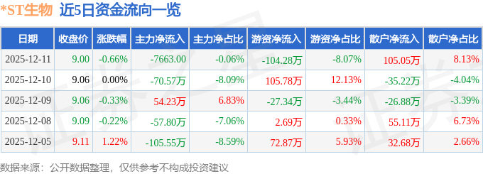 证券之星消息,截至2025年12月11日收盘,*ST生物(000504)报收于9.0元,下跌0.66%,换手率0.44%,成交量1.44万手,成交额1292.18万元。