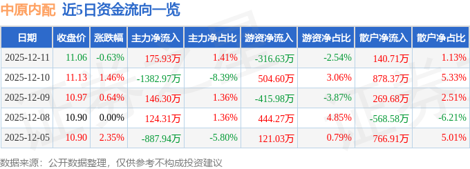 证券之星消息,截至2025年12月11日收盘,中原内配(002448)报收于11.06元,下跌0.63%,换手率2.48%,成交量11.29万手,成交额1.25亿元。