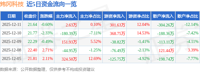 证券之星消息,截至2025年12月11日收盘,炜冈科技(001256)报收于21.64元,下跌0.6%,换手率2.83%,成交量1.16万手,成交额2505.86万元。