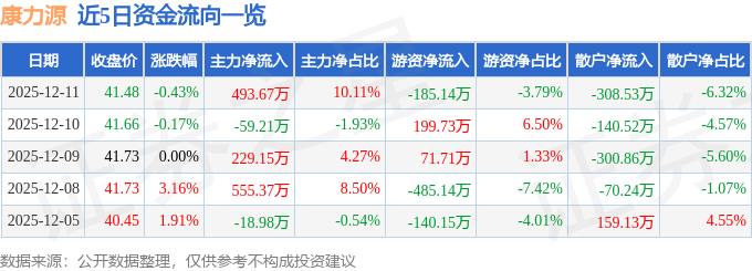 12月11日的资金流向数据方面,主力资金净流入493.67万元,占总成交额10.11%,游资资金净流出185.14万元,占总成交额3.79%,散户资金净流出308.53万元,占总成交额6.32%。