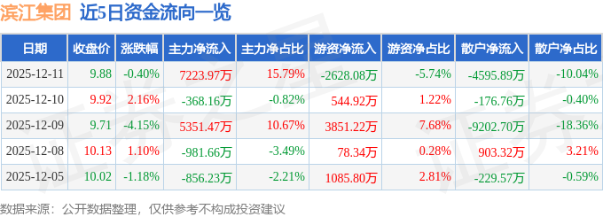 证券之星消息,截至2025年12月11日收盘,滨江集团(002244)报收于9.88元,下跌0.4%,换手率1.73%,成交量46.34万手,成交额4.58亿元。