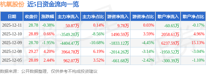 证券之星消息,截至2025年12月11日收盘,杭氧股份(002430)报收于28.78元,下跌0.38%,换手率1.25%,成交量12.25万手,成交额3.55亿元。