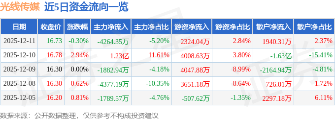 证券之星消息,截至2025年12月11日收盘,光线传媒(300251)报收于16.73元,下跌0.3%,换手率1.76%,成交量48.81万手,成交额8.2亿元。