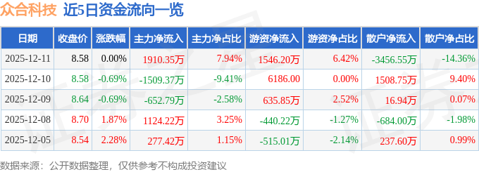 12月11日的资金流向数据方面,主力资金净流入1910.35万元,占总成交额7.94%,游资资金净流入1546.2万元,占总成交额6.42%,散户资金净流出3456.55万元,占总成交额14.36%。