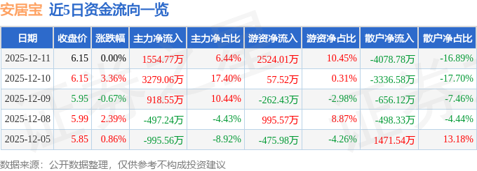 证券之星消息,截至2025年12月11日收盘,安居宝(300155)报收于6.15元,上涨0.0%,换手率11.78%,成交量38.95万手,成交额2.41亿元。