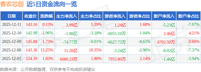证券之星消息,截至2025年12月11日收盘,香农芯创(300475)报收于143.16元,上涨0.13%,换手率11.47%,成交量51.09万手,成交额74.03亿元。