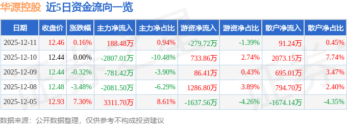证券之星消息,截至2025年12月11日收盘,华源控股(002787)报收于12.46元,上涨0.16%,换手率6.46%,成交量16.2万手,成交额2.01亿元。