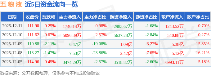 证券之星消息,截至2025年12月11日收盘,五 粮 液(000858)报收于111.9元,上涨0.25%,换手率0.41%,成交量15.79万手,成交额17.72亿元。