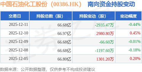 证券之星消息,12月11日南向资金减持2935.47万股中国石油化工股份(00386.HK)。近5个交易日中,获南向资金增持的有2天,累计净增持82.33万股。近20个交易日中,获南向资金增持的有15天,累计净增持2.1亿股。截至目前,南向资金持有中国石油化工股份(00386.HK)66.68亿股,占公司已发行普通股的27.83%。