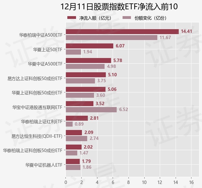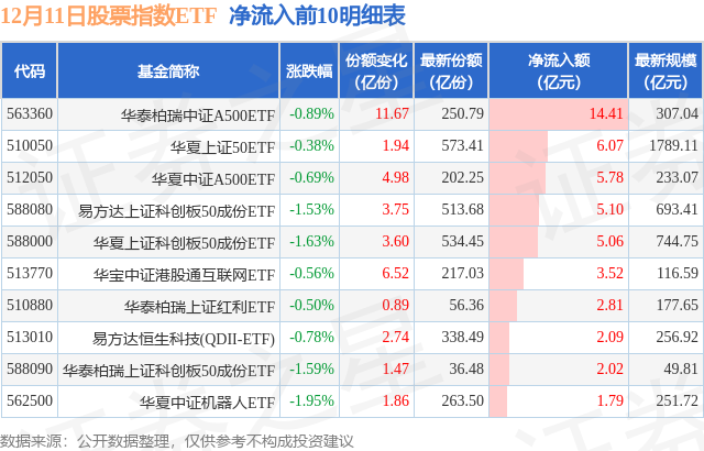 当日有157只股票指数ETF基金出现资金净流入,其中净流入排首位的是华泰柏瑞中证A500ETF(563360),份额增加了11.67亿份,净流入额为14.41亿元。