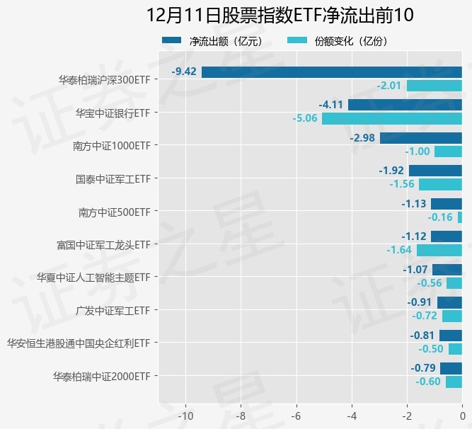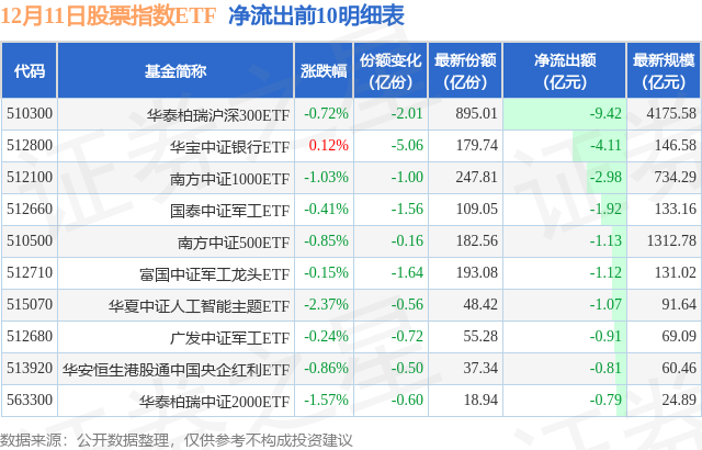 当日有185只股票指数ETF基金出现资金净流出,其中净流出排首位的是华泰柏瑞沪深300ETF(510300),份额减少了2.01亿份,净流出额为9.42亿元。