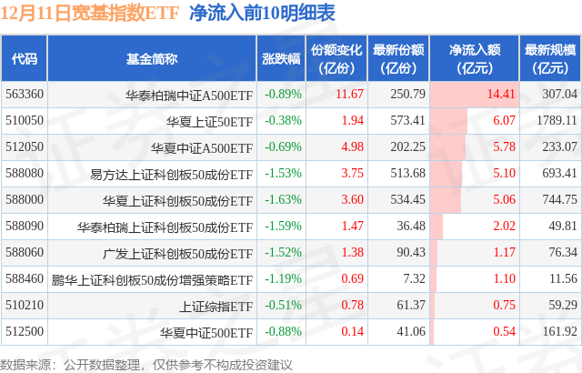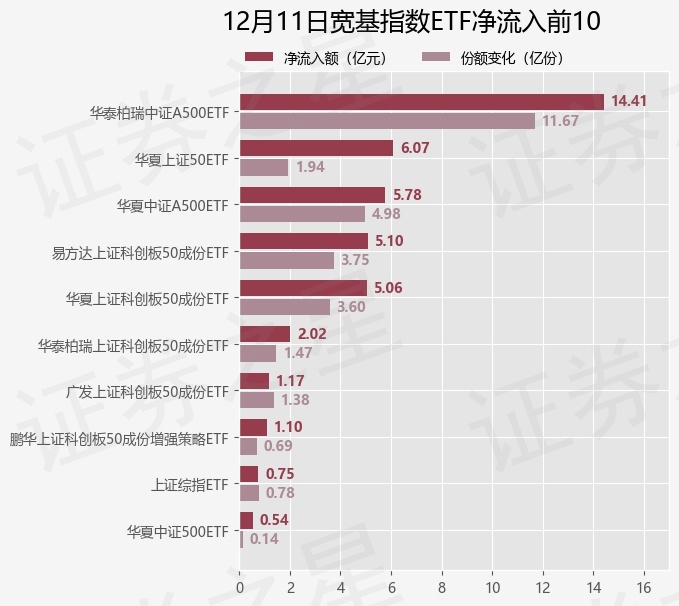 当日有32只宽基指数ETF基金出现资金净流入,其中净流入排首位的是华泰柏瑞中证A500ETF(563360),份额增加了11.67亿份,净流入额为14.41亿元。