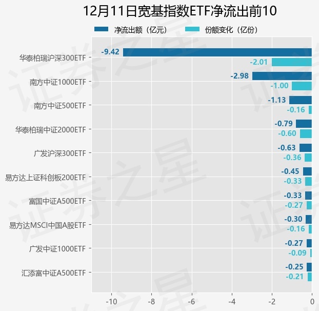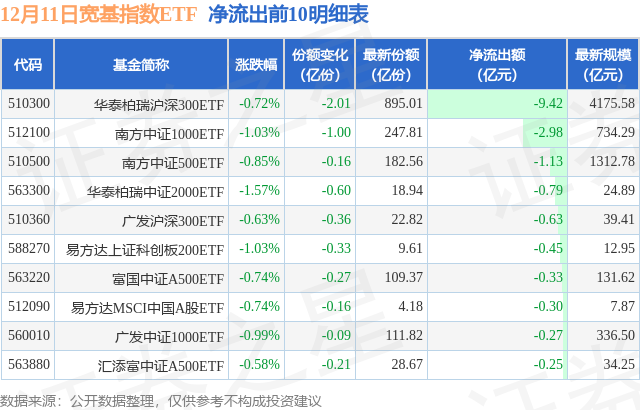 当日有50只宽基指数ETF基金出现资金净流出,其中净流出排首位的是华泰柏瑞沪深300ETF(510300),份额减少了2.01亿份,净流出额为9.42亿元。
