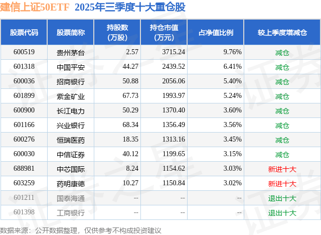 建信上证50ETF基金成立于2017年12月22日,基金经理为薛玲,基金跟踪标的为上证50指数,成立以来超额回报为37.2%,近一个月超额回报为0.08%。最新披露的基金持仓数据显示,截止2025年9月30日,该基金第一大重仓股为贵州茅台(600519),持股占比为9.76%。