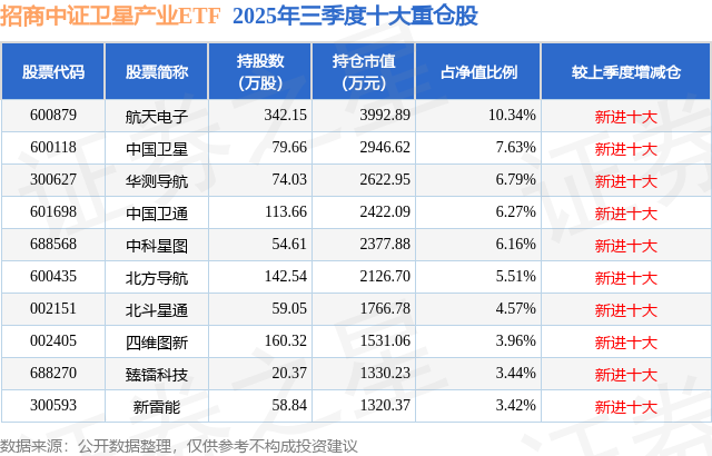 招商中证卫星产业ETF基金成立于2025年5月14日,基金经理为许荣漫,基金跟踪标的为中证卫星产业指数,成立以来超额回报为2.5%,近一个月超额回报为0.08%。最新披露的基金持仓数据显示,截止2025年9月30日,该基金第一大重仓股为航天电子(600879),持股占比为10.34%。