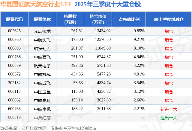 华夏国证航天航空行业ETF基金成立于2025年4月30日,基金经理为单宽之,基金跟踪标的为国证航天航空行业指数,成立以来超额回报为-8.91%,近一个月超额回报为0.06%。最新披露的基金持仓数据显示,截止2025年9月30日,该基金第一大重仓股为光启技术(002625),持股占比为9.85%。