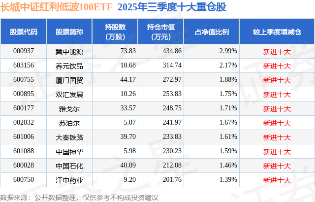 长城中证红利低波100ETF基金成立于2025年6月5日,基金经理为陶曙斌,基金跟踪标的为中证红利低波动100指数,成立以来超额回报为3.16%,近一个月超额回报为0.1%。最新披露的基金持仓数据显示,截止2025年9月30日,该基金第一大重仓股为冀中能源(000937),持股占比为2.99%。