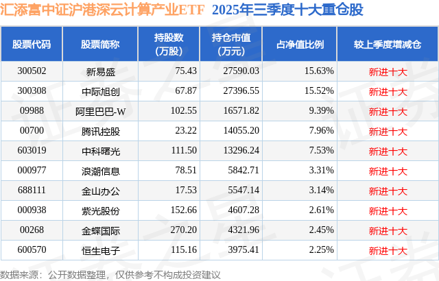 汇添富中证沪港深云计算产业ETF基金成立于2025年7月28日,基金经理为何丽竹,基金跟踪标的为中证沪港深云计算产业人民币指数,成立以来超额回报为-3.28%,近一个月超额回报为0.07%。最新披露的基金持仓数据显示,截止2025年9月30日,该基金第一大重仓股为新易盛(300502),持股占比为15.63%。