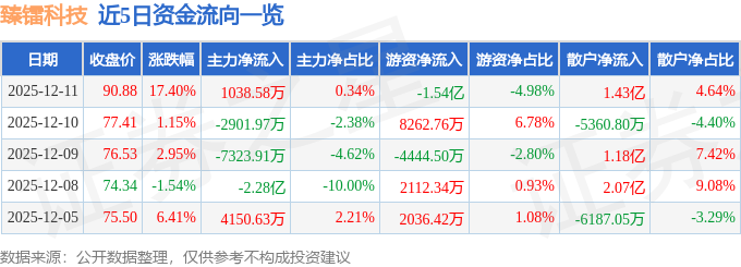 证券之星消息,截至2025年12月11日收盘,臻镭科技(688270)报收于90.88元,上涨17.4%,换手率16.51%,成交量35.35万手,成交额30.83亿元。