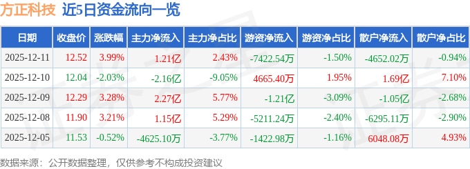12月11日的资金流向数据方面,主力资金净流入1.21亿元,占总成交额2.43%,游资资金净流出7422.54万元,占总成交额1.5%,散户资金净流出4652.02万元,占总成交额0.94%。