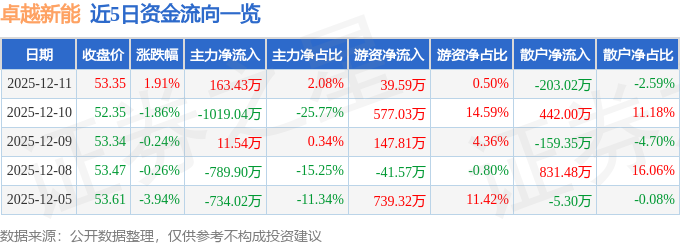 证券之星消息,截至2025年12月11日收盘,卓越新能(688196)报收于53.35元,上涨1.91%,换手率1.22%,成交量1.47万手,成交额7842.27万元。