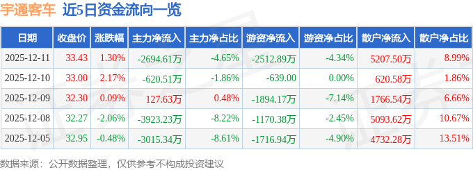 证券之星消息,截至2025年12月11日收盘,宇通客车(600066)报收于33.43元,上涨1.3%,换手率0.78%,成交量17.26万手,成交额5.79亿元。