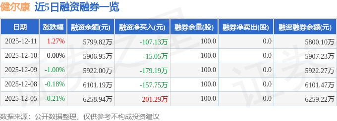 健尔康融资融券信息显示,融资方面,当日融资买入364.74万元,融资偿还471.87万元,融资净偿还107.13万元。融券方面,融券卖出0.0股,融券偿还0.0股,融券余量100.0股,融券余额0.28万元。融资融券余额5800.1万元。