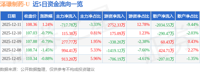 证券之星消息,截至2025年12月11日收盘,泽璟制药(688266)报收于108.36元,上涨1.24%,换手率0.76%,成交量2.01万手,成交额2.15亿元。