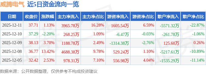 证券之星消息,截至2025年12月11日收盘,威腾电气(688226)报收于37.71元,上涨1.13%,换手率3.45%,成交量6.51万手,成交额2.44亿元。
