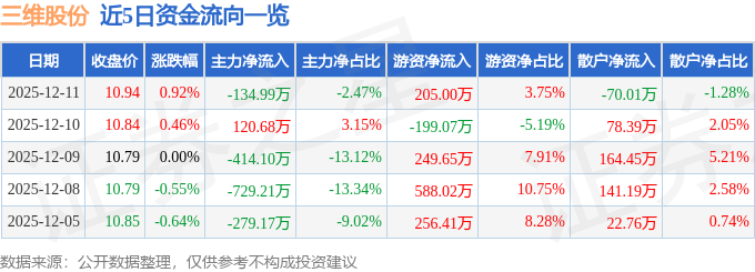 证券之星消息,截至2025年12月11日收盘,三维股份(603033)报收于10.94元,上涨0.92%,换手率0.49%,成交量5.0万手,成交额5472.71万元。