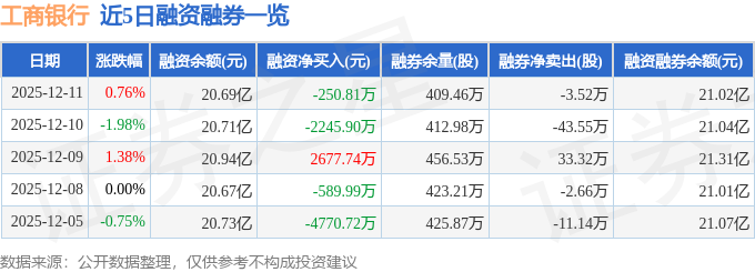 工商银行融资融券信息显示,融资方面,当日融资买入1.65亿元,融资偿还1.67亿元,融资净偿还250.81万元。融券方面,融券卖出34.71万股,融券偿还38.23万股,融券余量409.46万股,融券余额3275.68万元。融资融券余额21.02亿元。