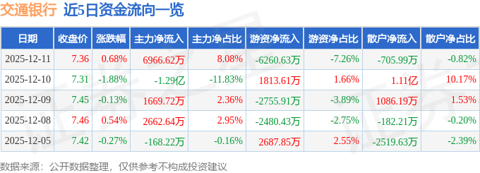 证券之星消息,截至2025年12月11日收盘,交通银行(601328)报收于7.36元,上涨0.68%,换手率0.45%,成交量117.6万手,成交额8.62亿元。