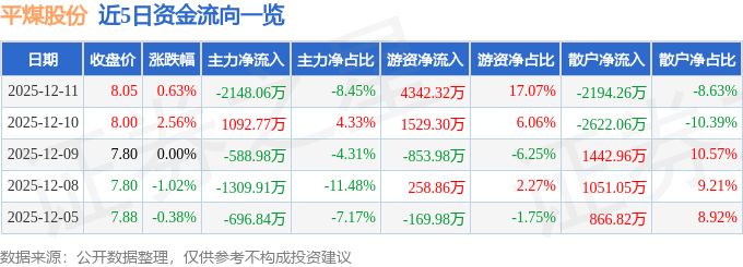 证券之星消息,截至2025年12月11日收盘,平煤股份(601666)报收于8.05元,上涨0.62%,换手率1.27%,成交量31.39万手,成交额2.54亿元。