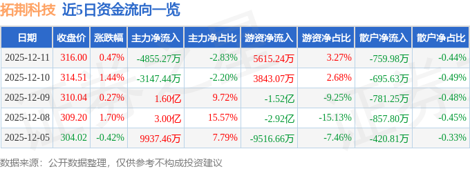证券之星消息,截至2025年12月11日收盘,拓荆科技(688072)报收于316.0元,上涨0.47%,换手率1.92%,成交量5.39万手,成交额17.16亿元。