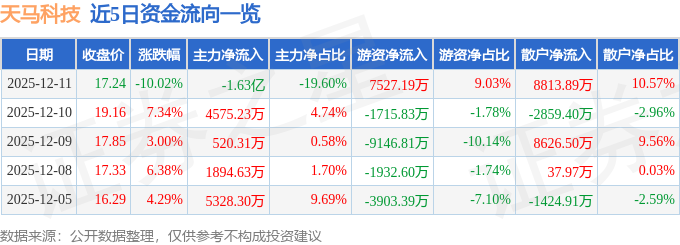 证券之星消息,截至2025年12月11日收盘,天马科技(603668)报收于17.24元,下跌10.02%,跌停,换手率9.25%,成交量46.73万手,成交额8.34亿元。