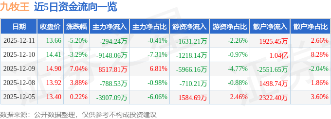 证券之星消息,截至2025年12月11日收盘,九牧王(601566)报收于13.66元,下跌5.2%,换手率9.28%,成交量53.3万手,成交额7.23亿元。