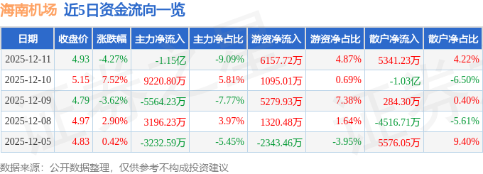 证券之星消息,截至2025年12月11日收盘,海南机场(600515)报收于4.93元,下跌4.27%,换手率2.73%,成交量250.95万手,成交额12.65亿元。