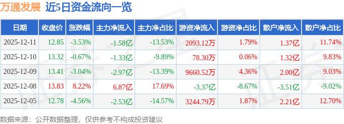 证券之星消息,截至2025年12月11日收盘,万通发展(600246)报收于12.85元,下跌3.53%,换手率4.75%,成交量89.85万手,成交额11.7亿元。