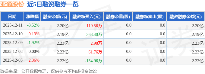 亚通股份融资融券信息显示,融资方面,当日融资买入754.03万元,融资偿还634.47万元,融资净买入119.56万元。融券方面,融券卖出0.0股,融券偿还0.0股,融券余量0.0股,融券余额0.0万元。融资融券余额2.2亿元。